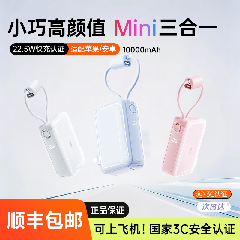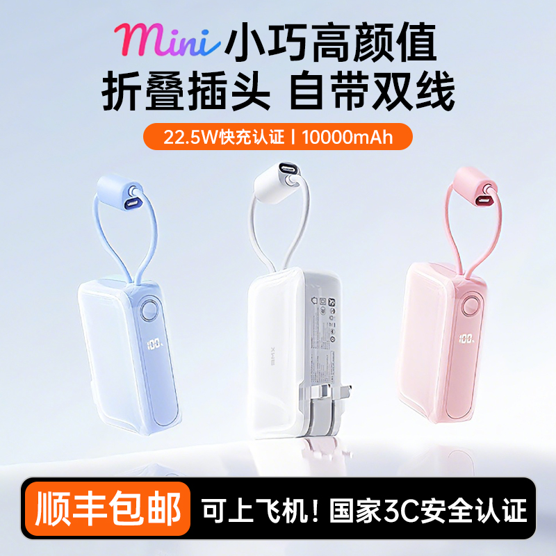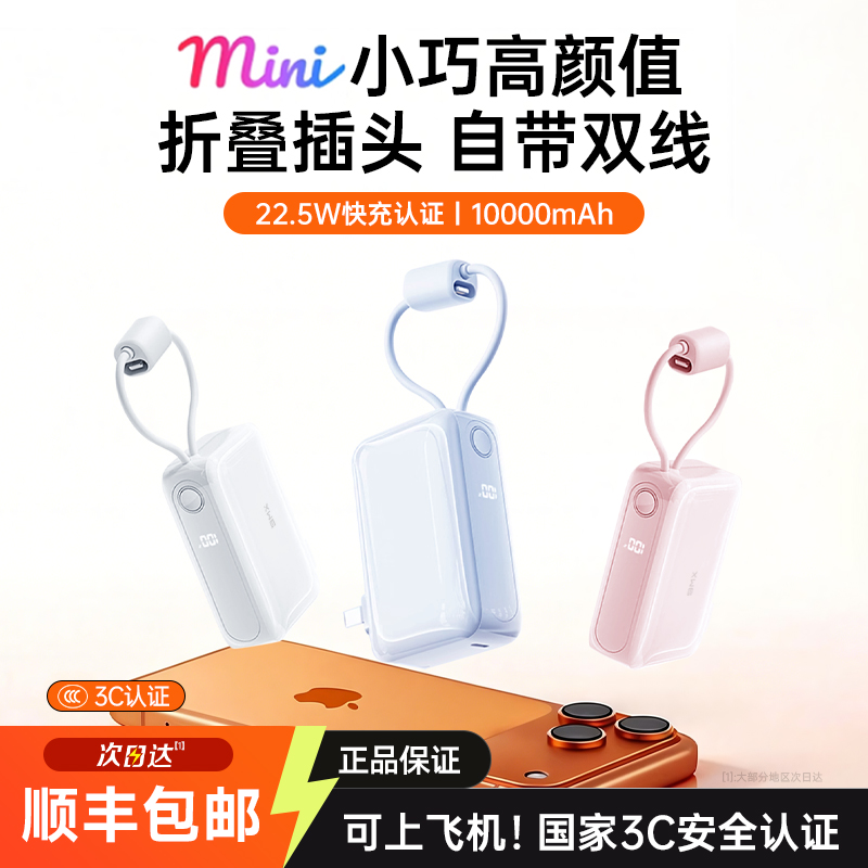 [充电宝3c认证可上飞机]2026新款自带线插头10000毫安大容量随身便携带适用iPhone16苹果17手机专用移动电源